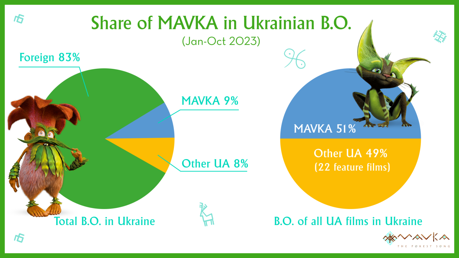 MAVKA’s share of the total national box office in the first 10 months of 2023 stands at 9%, while its share of the box office among all Ukrainian releases in 2023 (10 months) is 51%.
