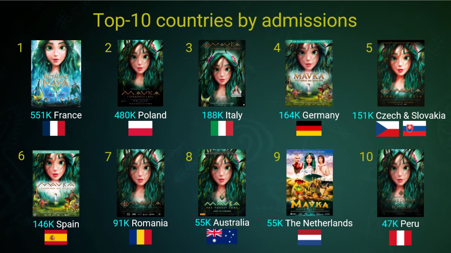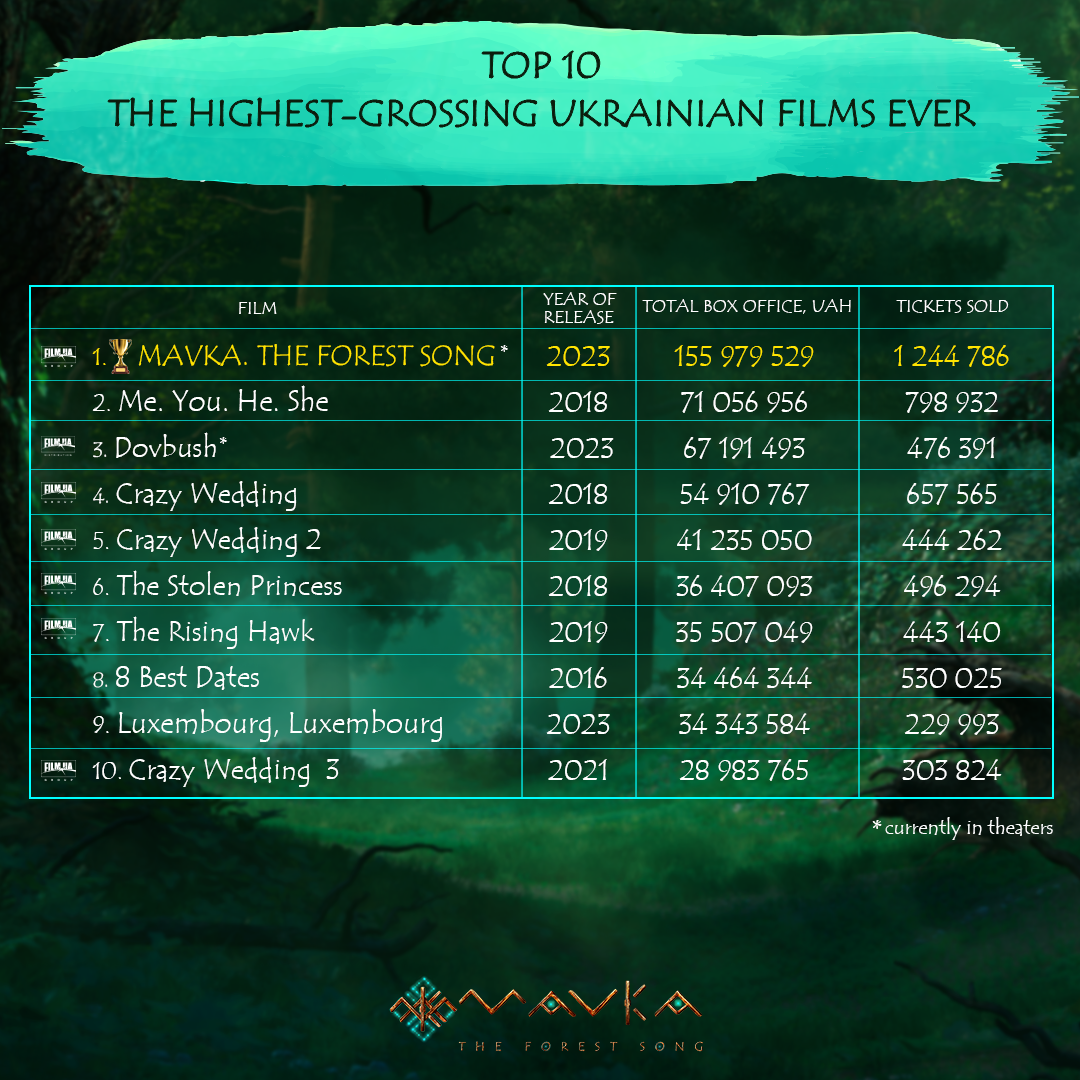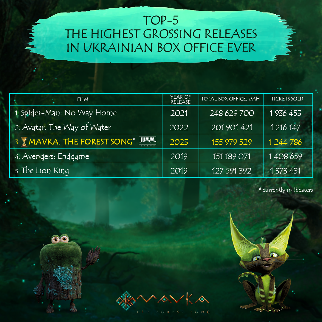 MAVKA is a #3 highest grossing release in Ukrainian box office ever just only after SPIDER-MAN: NO WAY HOME (2021) and AVATAR: THE WAY OF WATER (2022). The animated film has been in theaters for 39 weeks and has already been released on a digital platform.